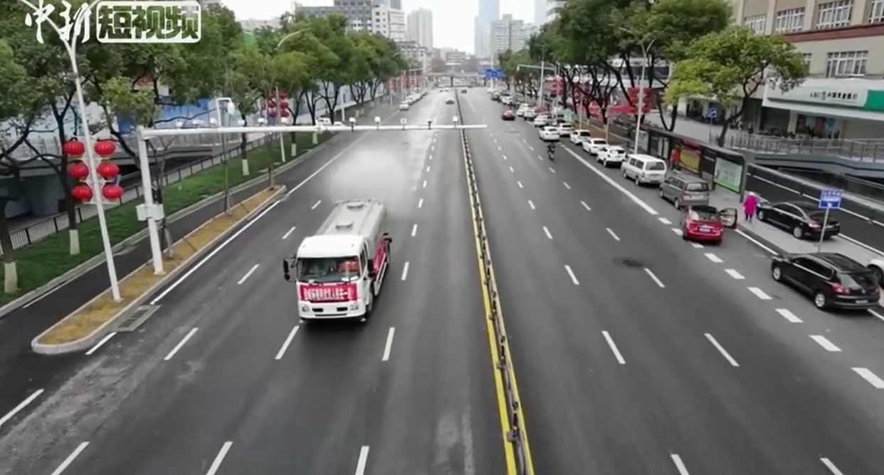 中国新闻网2月7日报道,武汉市江汉环卫一辆清洁消毒车从新华路协和医院门口缓缓驶过,环卫司机沈义凯正在对道路进行喷雾消毒作业。